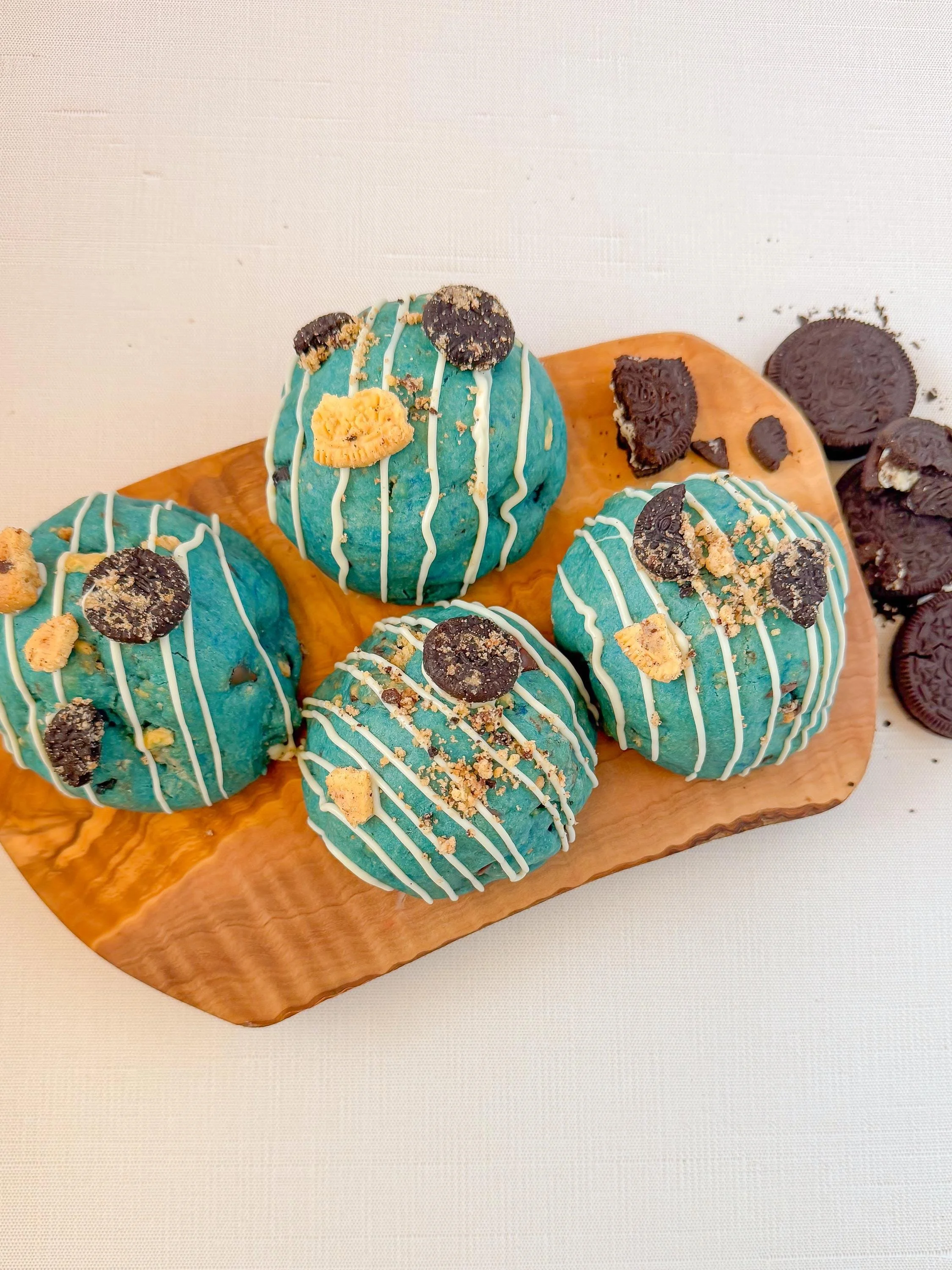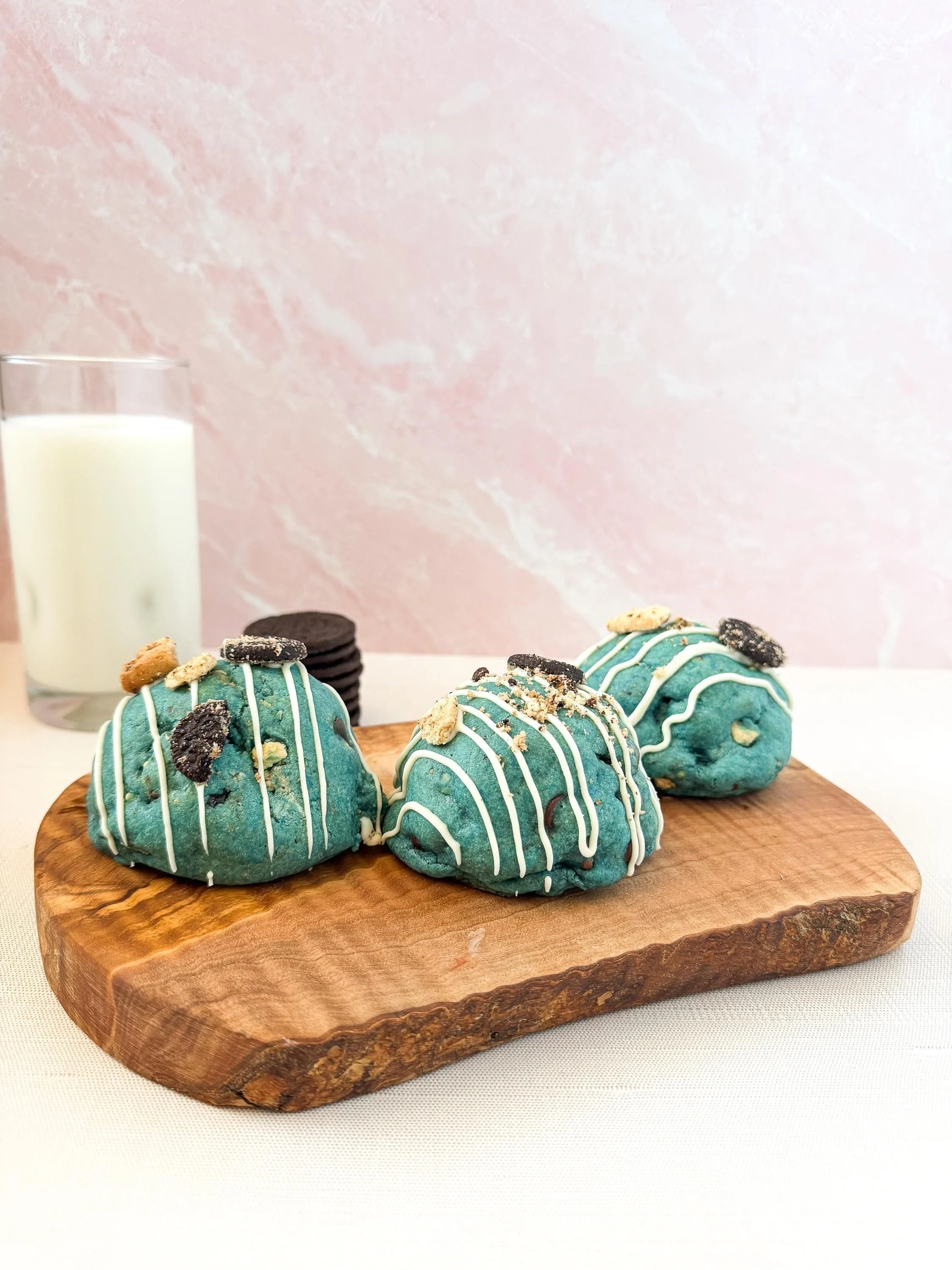 A bold New York–style blue cookie stuffed with an Oreo and a chocolate chip cookie, packed with cookie pieces throughout. Crunchy, chewy, and wildly over-the-top — just the way cookies should be.