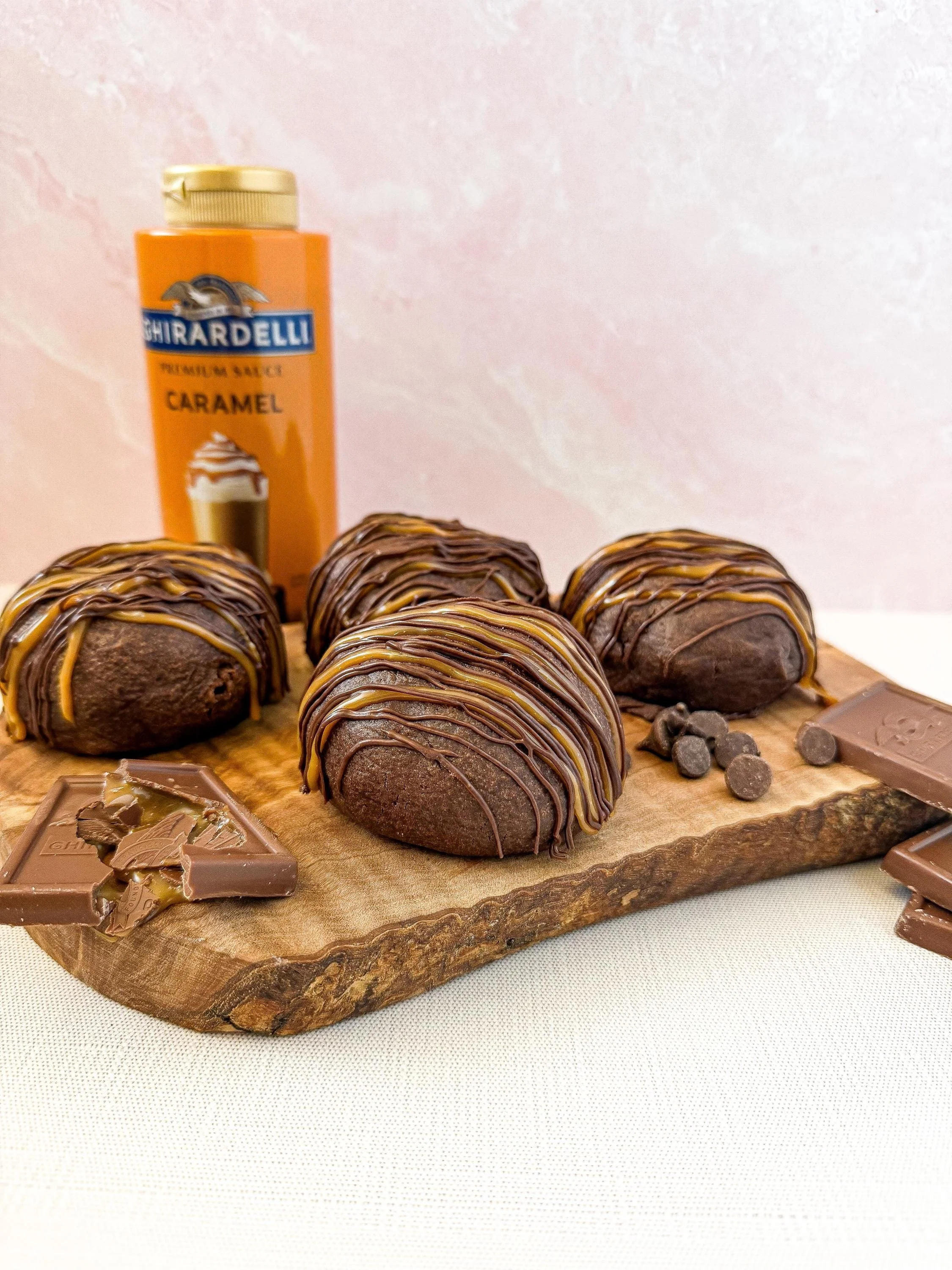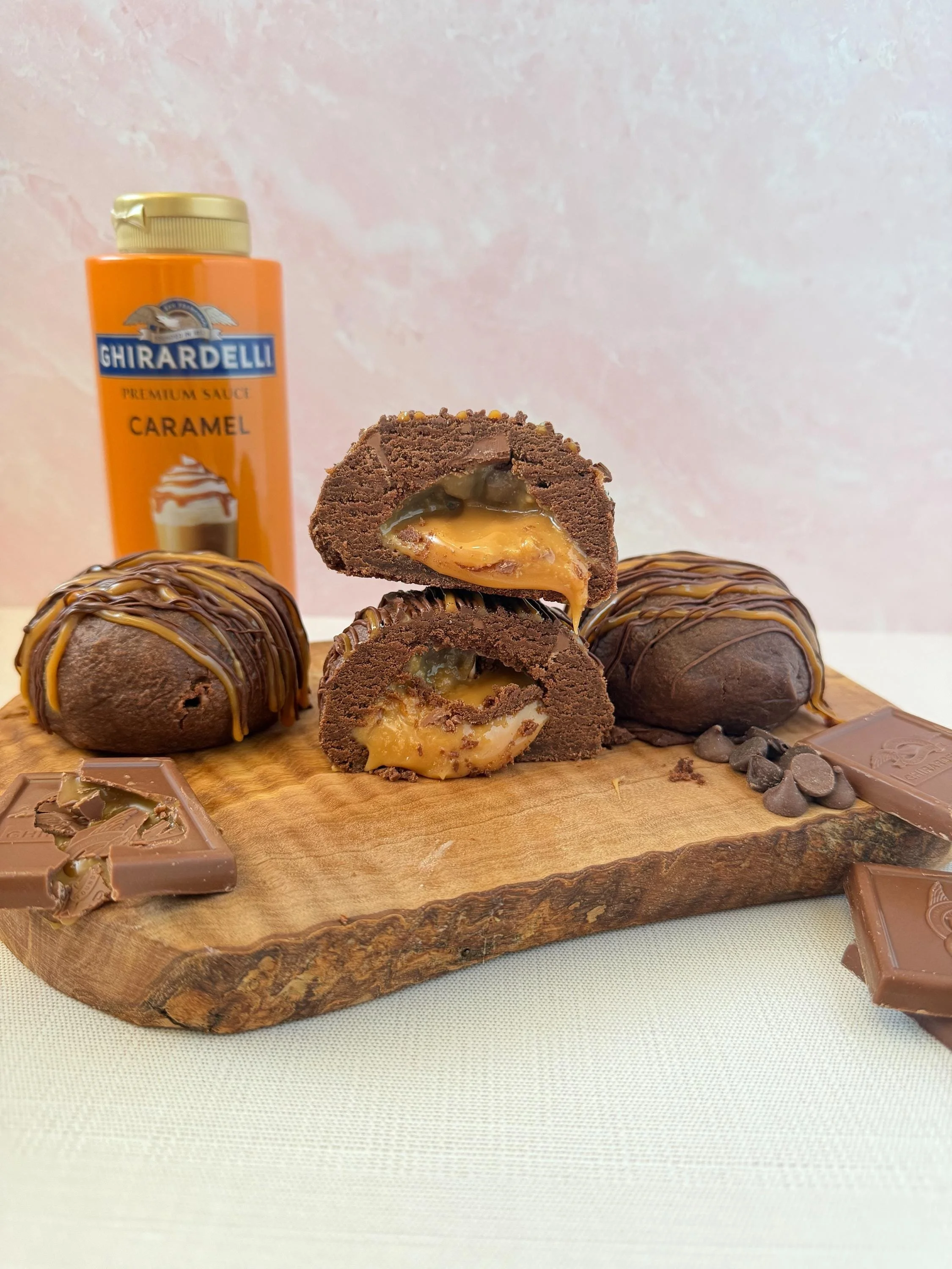 A decadent chocolate cookie filled with luscious caramel fudge, studded with melty chocolate and caramel chips, and topped with our signature chocolate drizzle. Sweet, gooey, and utterly luxurious.