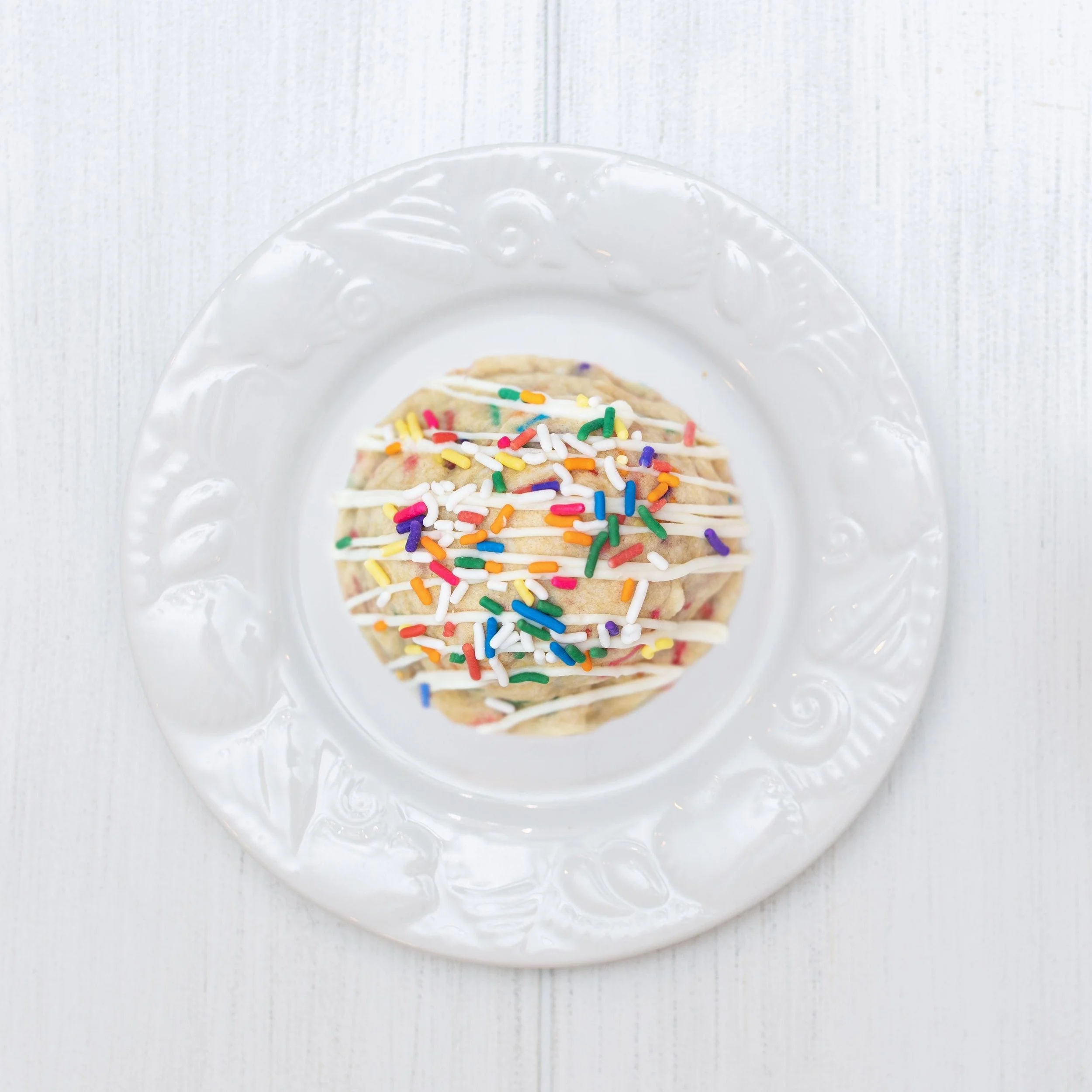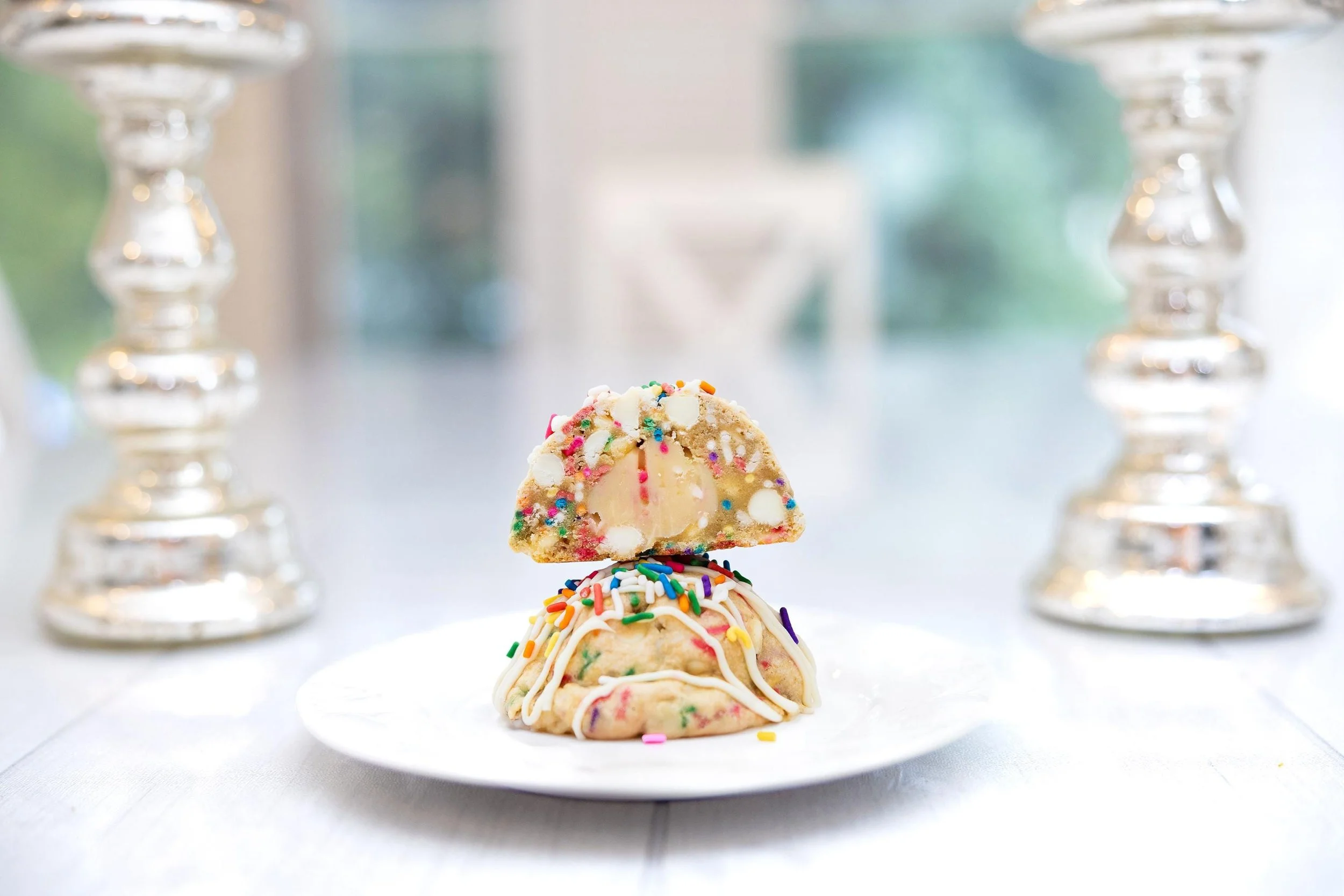 A soft, buttery cake batter cookie overflowing with creamy birthday cake fudge, packed with rainbow sprinkles and melty white chocolate chips. It’s a party in every bite!